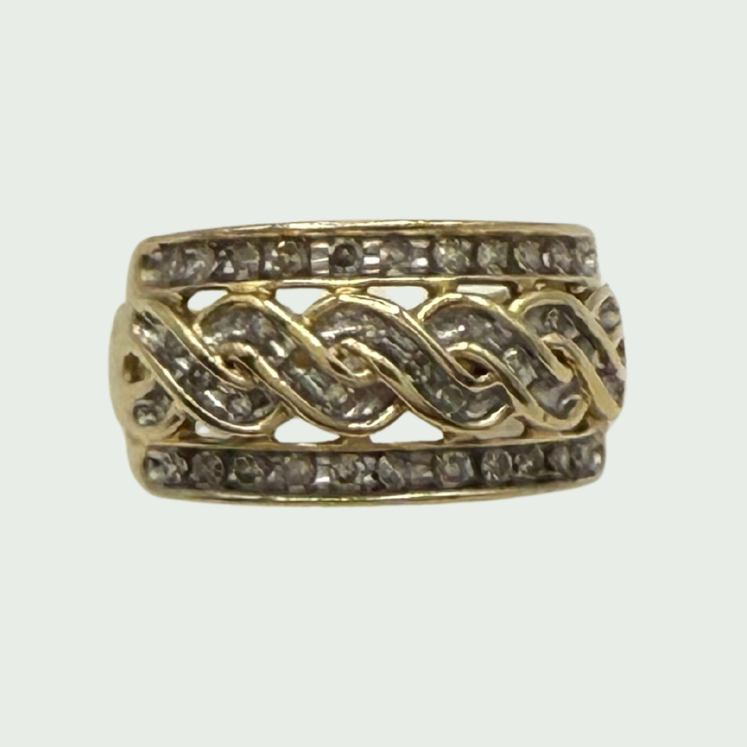 Anillo en oro de 10 kilates con diseño trenzado y circones brillantes. Compra fácil por WhatsApp o SMS. Elegancia con presencia y estilo.